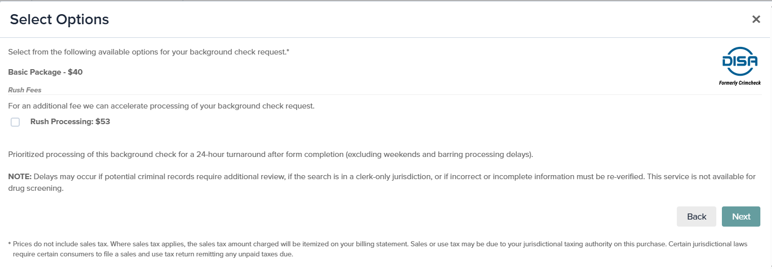NOTE: You can also request expidited processing for an additional fee, but we do not recommend adding it when a Drug Screening is selected. Drug Screenings cannot be rushed and will delay delivery of your rush order.