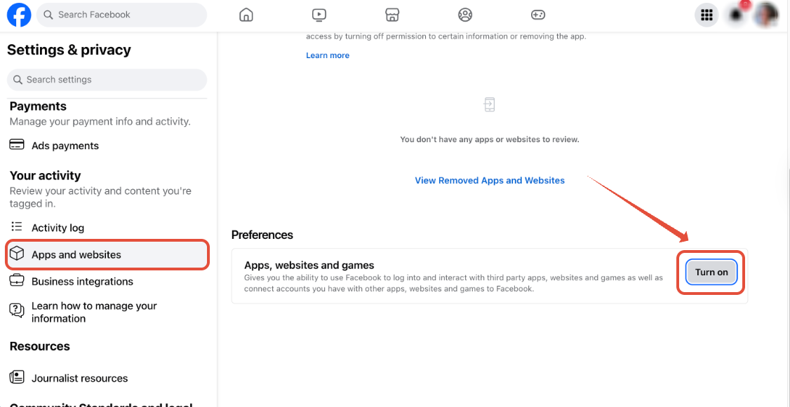 Facebook occasionally updates its platform settings, and one common issue is when the “Apps, Websites and Games” feature is turned off. This setting must be enabled in order to use Facebook to interact with third-party platforms (such as sharing job posts from your ATS).