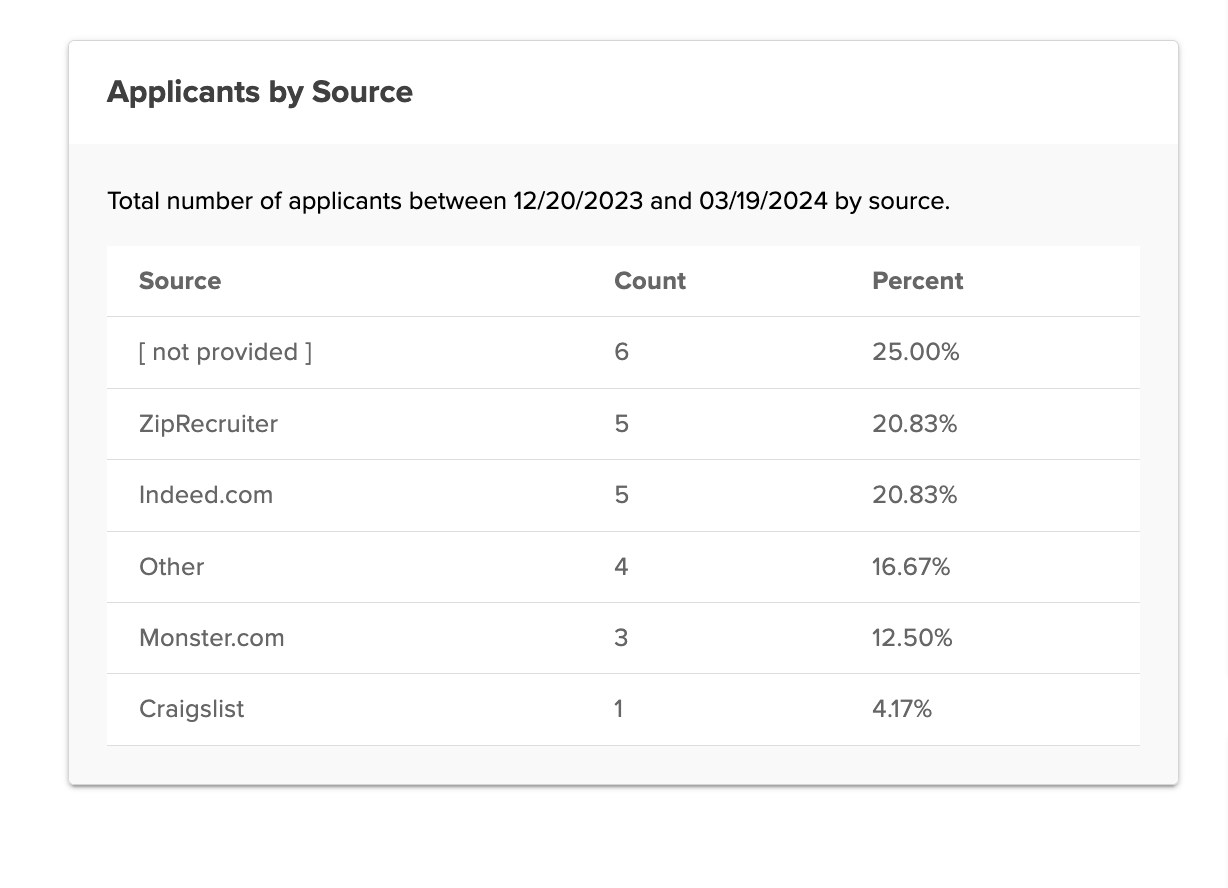 Here, you’ll find a breakdown of applicant sources, helping you pinpoint which channels are delivering top candidates.