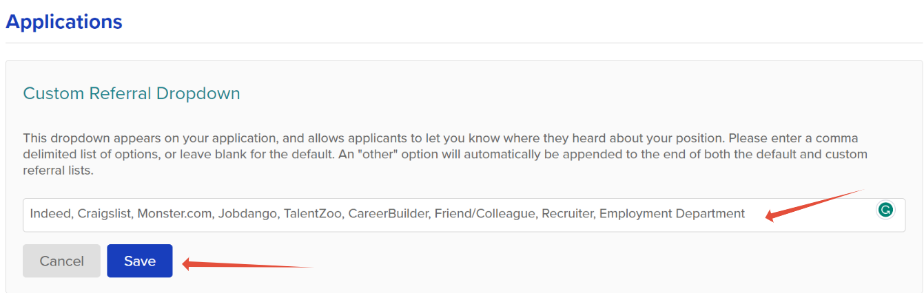 - In the Custom Referral Dropdown field, edit the existing list or add new external sources you use to attract applicants.
