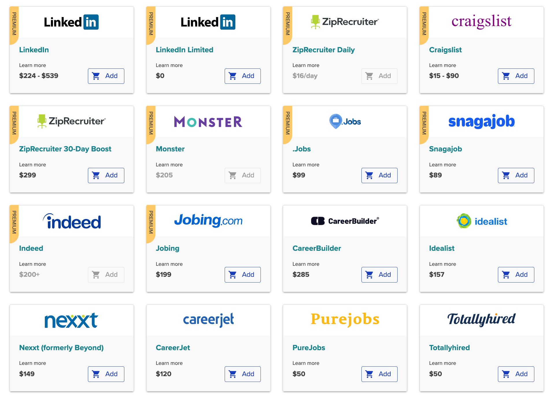 - Choose the paid job board(s) you want and click Add to include them in your cart.